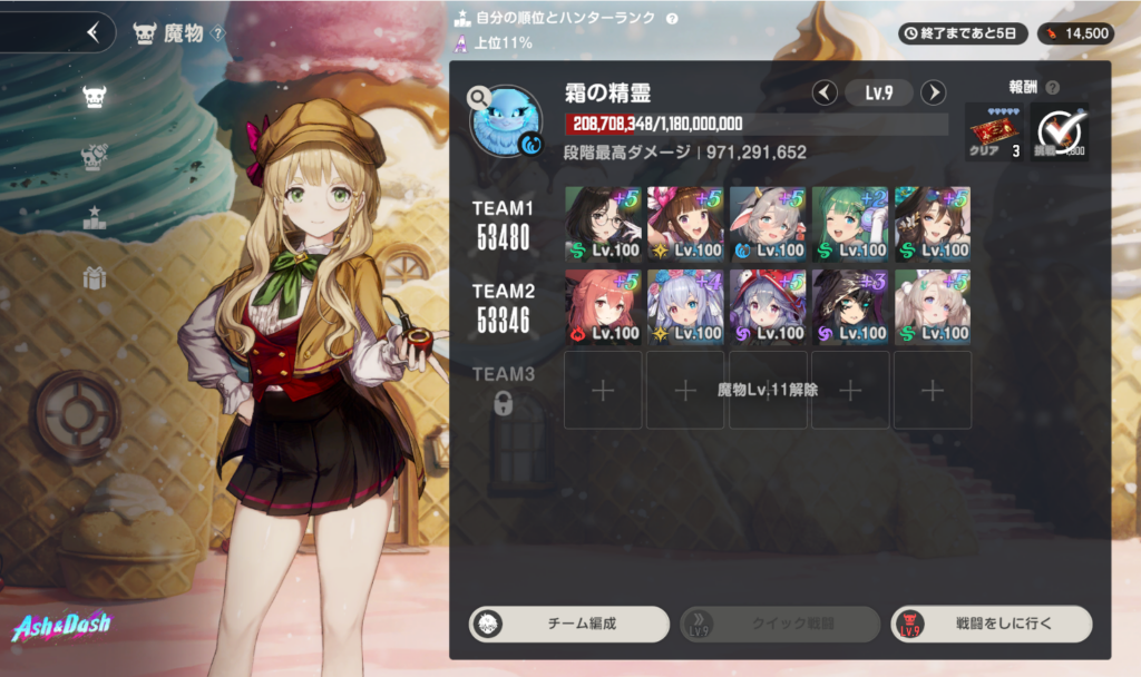編成はこんな感じ。初日でレベル8までクリア!まだ編成は悩んでいる途中で多少変わる可能性があるのですが、今回は「ティル」「ネブリス」あたりがアタッカーとして非常に強力ですね。あとは風属性のアタッカーで補強してる感じ。