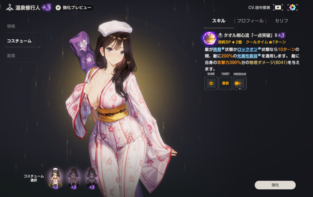 今日はBrownDust2(ブラウンダスト2)のキャラクターである「ヴェンタナ」について紹介したい。本作ではキャラクターごとに様々なコスチュームがあり、ヴェンタナも色々なコスチュームが実装されているのだが、この記事では「温泉修行人 ヴェンタナ」のみ紹介する。
