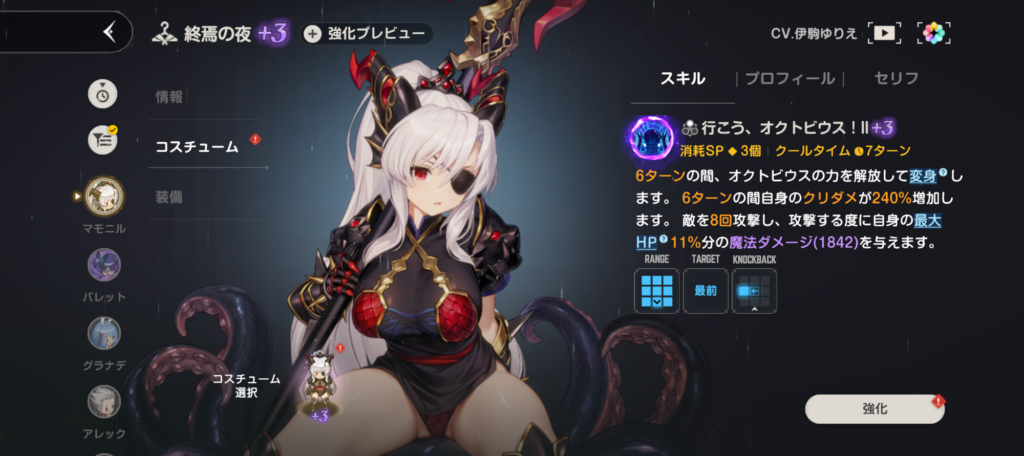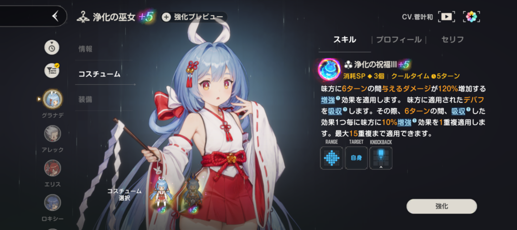 「浄化の巫女 グラナデ」。正直、今回のボスじゃなくても大体入れておけば強いキャラクターなのだが・・・。今回はボスが「圧迫」というデバフを与えてくるんだけど、このキャラのスキルで【デバフ吸収】があり、更にダメージを底上げしてくれる。
