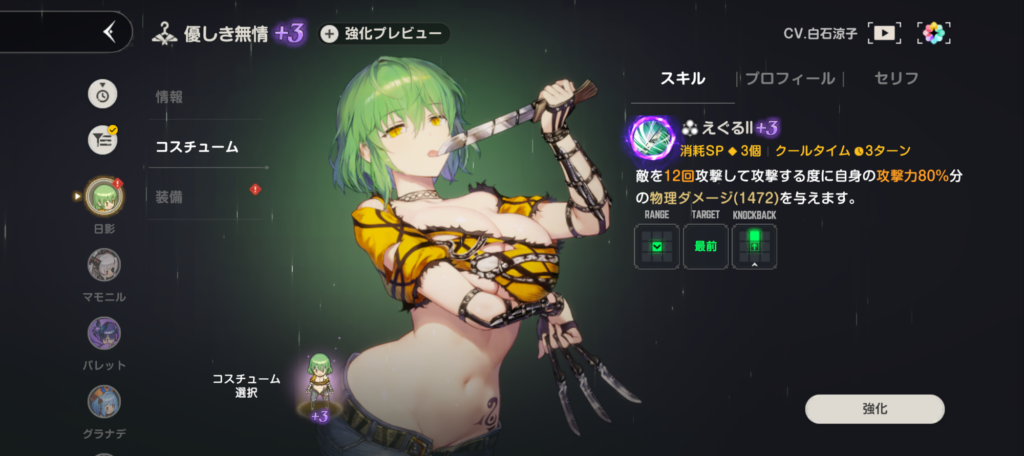 特に日影は現在コラボガチャで手に入るので、攻撃回数が多いキャラクターを持ってない人はここで確保しておくのもあり。また「4凸」以上でクールタイムが「1」になり、毎ターンスキルを使う事ができるようになるので強くオススメ!