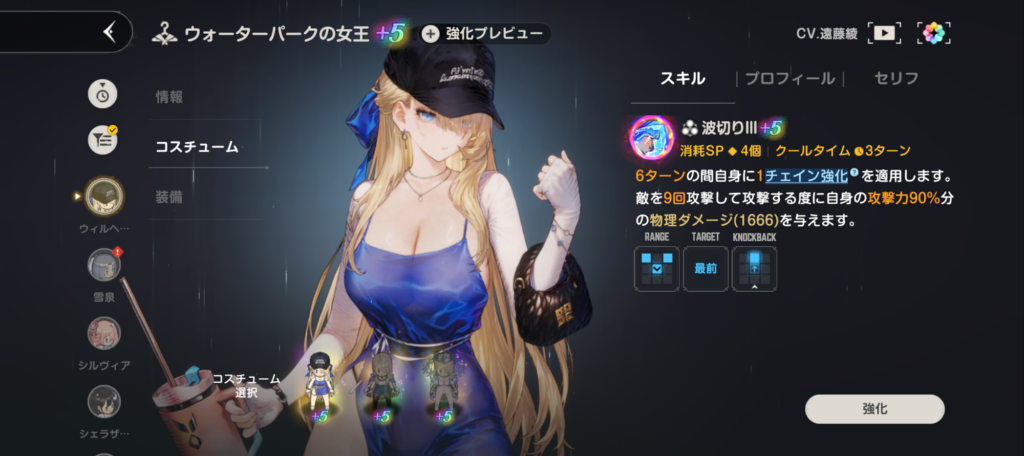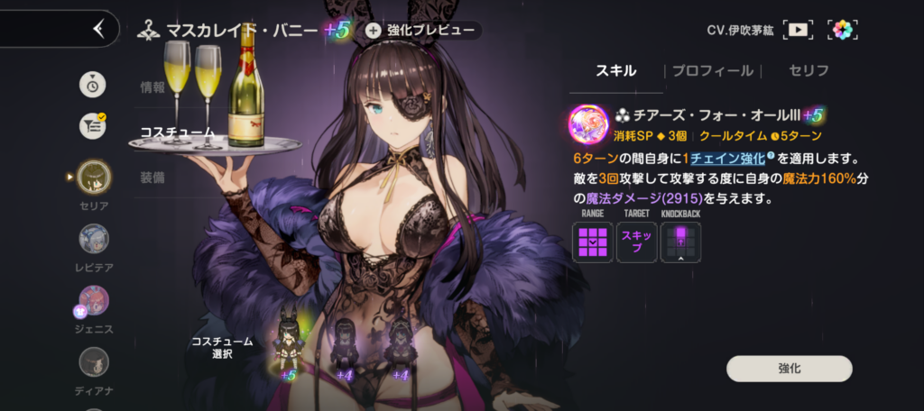 セリアもオススメなキャラクター!画像のバニーコスチュームは勿論、全てのコスチュームが攻撃回数が5回以上あるため、非常に活躍させやすい。