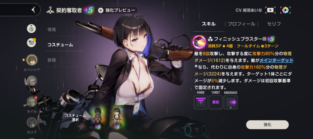 ルベンシアは2着コスチュームがあるんだけど、どちらも8回攻撃できるので非常に扱いやすい。適当にスキルを打つだけでも、十分に活躍してくれると思う。限界突破は画像だと完凸してるけど、無凸でも全然大丈夫。